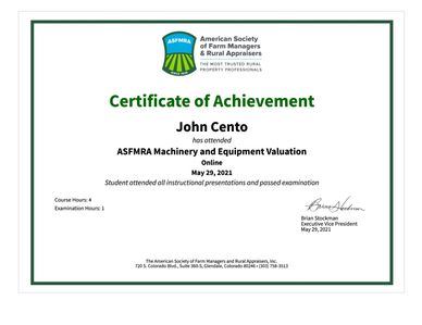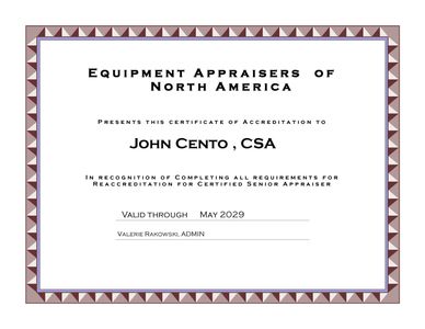 Completed the Equipment Appraiser Association of North America's accredited appraiser program including experience, examination and peer-reviewed appraisal report requirements in March 2021. Advanced to Senior Appraiser in 2024.